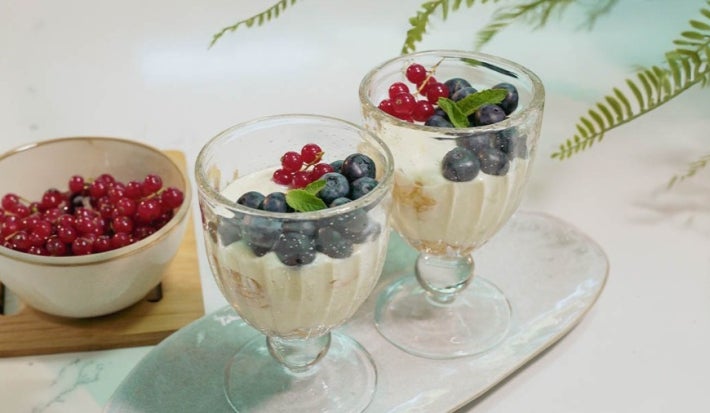 - 3.Agrega los arándanos encima, y de ser necesario repite el proceso de galletas, relleno y arándanos hasta llenar la copa. Decora con una hoja de menta y berries a elección y refrigera mínimo 1 hora antes de servir.